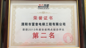 溧陽(yáng)市富奎電梯工程有限公司 溧陽(yáng)市富奎電梯工程有限公司是于二OO八年一月九日在原前身溧陽(yáng)市電梯工程公司基礎(chǔ)上成立的,是專業(yè)從事電梯銷售安裝維修、保養(yǎng)的企業(yè)。是國(guó)家質(zhì)監(jiān)總局頒發(fā)的特種設(shè)備安裝、改造、維修A級(jí)安裝許可證單位。公司組織機(jī)構(gòu)實(shí)行總經(jīng)理負(fù)責(zé)制,公司下設(shè)管理部、銷售部、安裝維修部、質(zhì)安部、財(cái)務(wù)部,公司另外設(shè)十二個(gè)分公司:四川分公司、江蘇分公司、上海分公司、浙江分公司、湖南分公司、遼寧分公司、山東分...